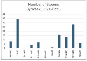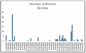 The 114 total can be somewhat misleading. Almost half of the reports were on three dates: July 28 (28), September 23 (10), and September 24 (17). Last year, August was a big month for blooms. This year we only had 4 days with at least one bloom between July 31 and September 7 (nine total confirmed blooms). We are never sure why these things happen, but it could be that the winds were high during August this year and they seemed much quieter last year. That said, no one can predict with certainty when a bloom will occur, or where.