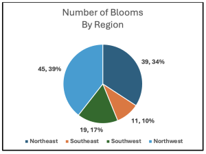 The following three graphs will help visualize the season. The first graph is the number of confirmed blooms on a particular date. The second shows confirmed blooms grouped by week (Mon-Sun). The third is a breakout by region.