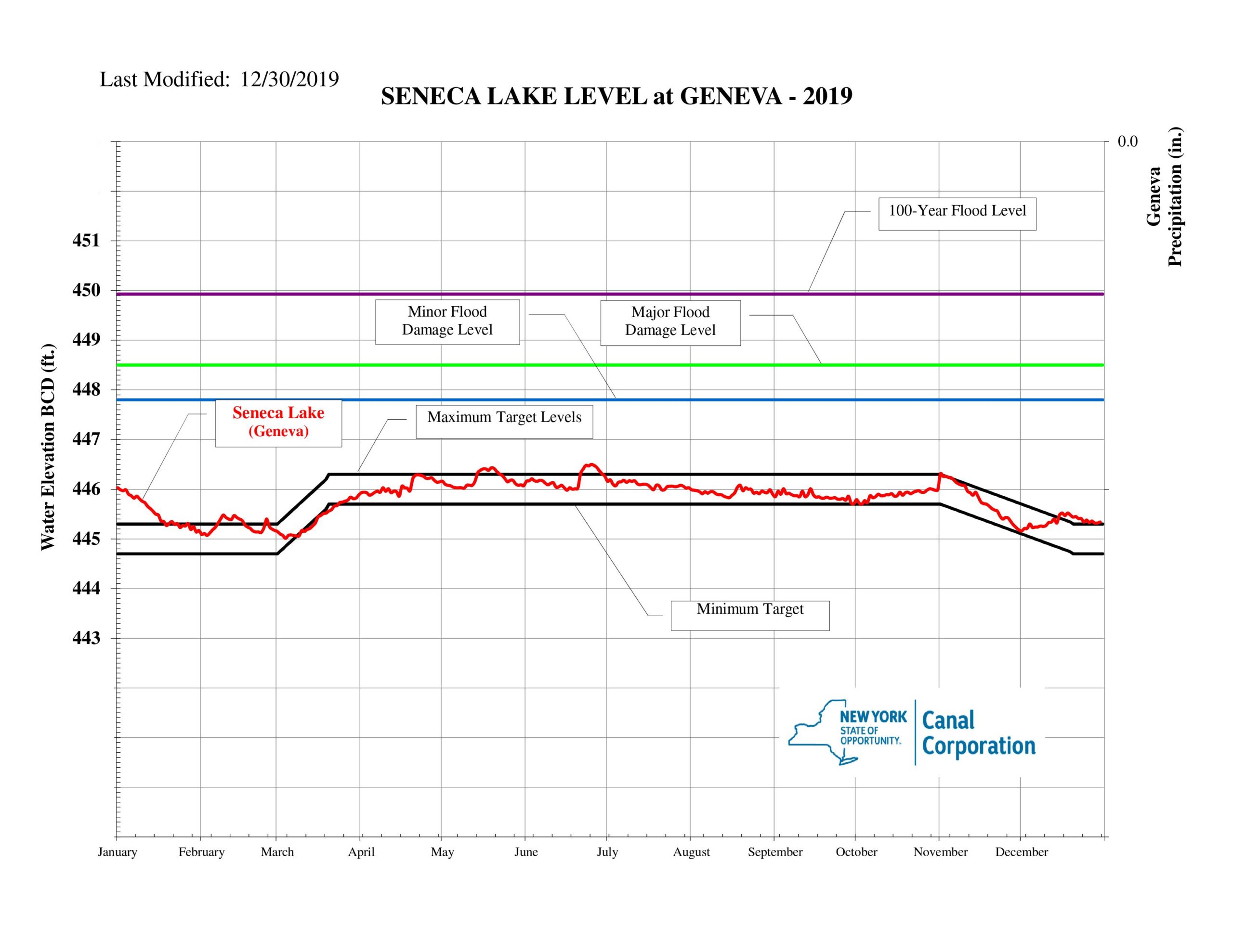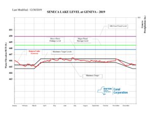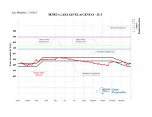 Gravity Renewables (now managed by Relevate Power) oversees the hydroelectric plants in Waterloo and Seneca Falls and is licensed by the Federal Energy Regulatory Authority (FERC). The FERC license requires the company to control the Seneca Lake level according to a “rule curve” that provides for summer and winter levels, and the transition periods between. The lines on the chart indicate these rule curve limits. The power plants manage the flow in the canal via turbine gates. In addition, the New York State Canal Corporation operates a small bypass gate and locks on the canal. Seneca Lake discharges to Cayuga Lake, where discharge is managed by the NYS Canal Corporation (NYSCC). NYSCC’s responsibilities focus on safe navigation through New York State canals.