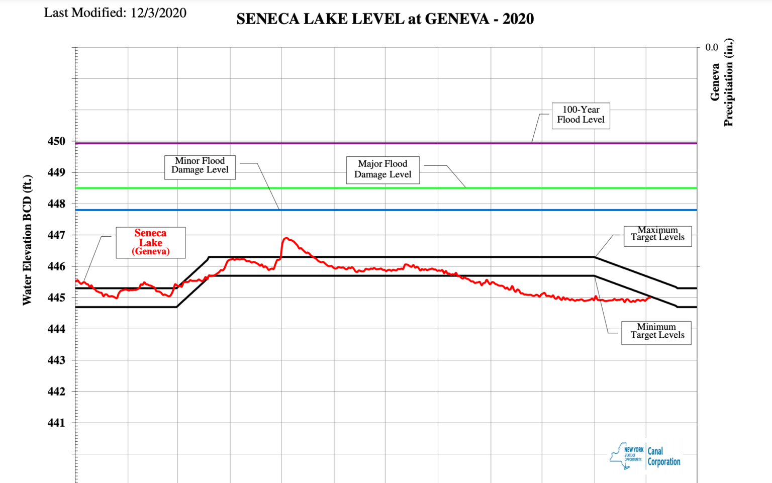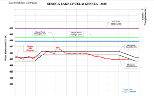 There is a long history of concerns regarding Seneca Lake’s water levels and whether they are out of control. High and low water levels can cause severe issues, both in the water and on shore. High water can damage docks, erode shorelines, and threaten beach dwellings. Low water can create navigational issues, strand boats in their lifts, and threaten water supplies. The summer of 2020 saw drought in the Seneca Lake watershed that resulted in late summer–early fall lake levels that had not been seen in several years. The NYS Canal Corporation maintains a lake level measurement at the north end of the lake and keeps an up-to-date chart showing elevation of the lake in feet versus time. The 2020 chart shown below indicates that water levels were below the lower control limit since mid-August.