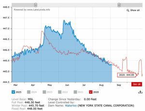 GENEVA, N.Y. – This year, Seneca Lake is experiencing unusually low water levels, similar to what we saw in 2020. As of Thursday, September 4, the lake measures 445.34 ft, essentially at the winter target and 6 inches below the summer target low. While these conditions can raise concerns for boaters, shoreline property owners, and the local ecosystem, it’s important to understand the natural and managed factors that influence lake levels.